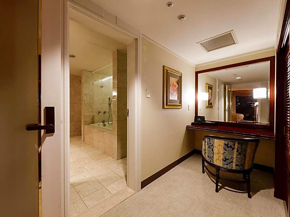 This room can accommodate small children. There is another bedroom in the back with 2 twin-beds. Each room includes a TV and writing desk. There is a stool and large mirror available in the vanity room.